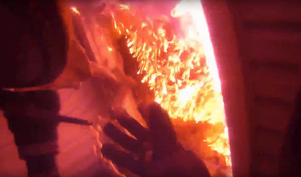 Jerky motions from the helmet-view camera capture the fire from a first-responder’s perspective, as firefighters are shown attacking flames bursting from the deck area of the apartment.