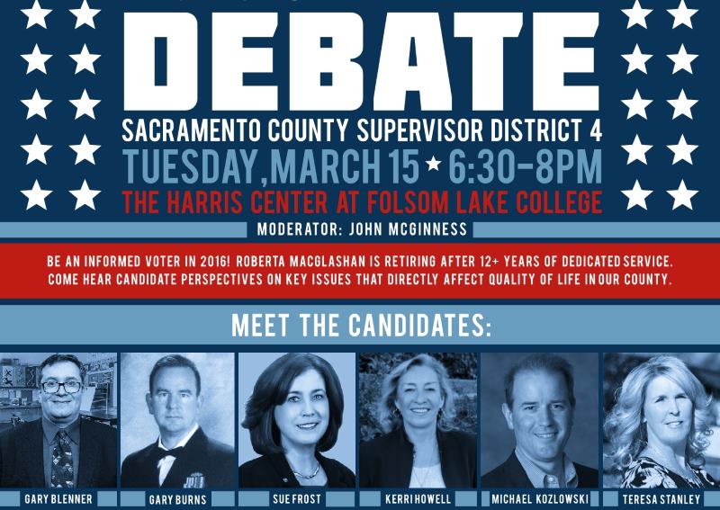 Candidates for Sacramento County Supervisor District 4, which covers Citrus Heights, are scheduled for a debate inside the Harris Center at Folsom Lake College on Tues., March 15.
