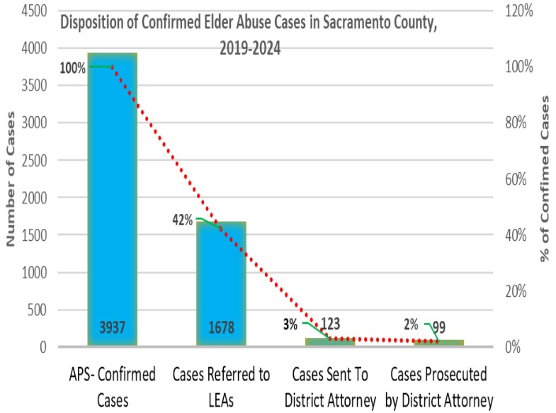 According to the report, from 2019 through 2024, Sacramento County Adult Protective Services (APS) confirmed almost 4,000 cases of elder financial abuse and referred 1,678 of those cases to law enforcement. According to data from the DA’s office, only 123 cases were referred to the District Attorney’s Office for possible prosecution, and the office only filed charges on 99 of the 123 cases.
