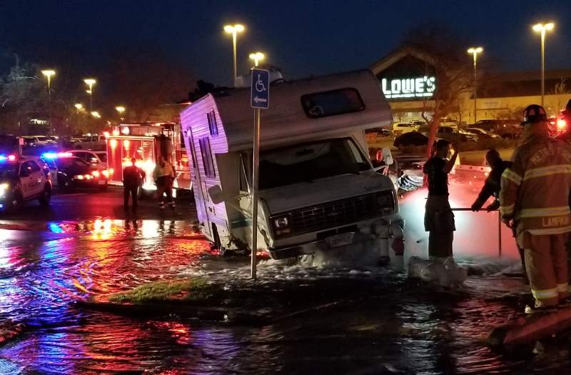 As of 5:45 p.m., westbound lanes of Greenback were still completely blocked and water was still gushing from the hydrant. Live streaming video taken at the scene by The Sentinel around 6 p.m. shows a large geyser of water shoot 30 feet into the air after the RV was lifted off the hydrant.