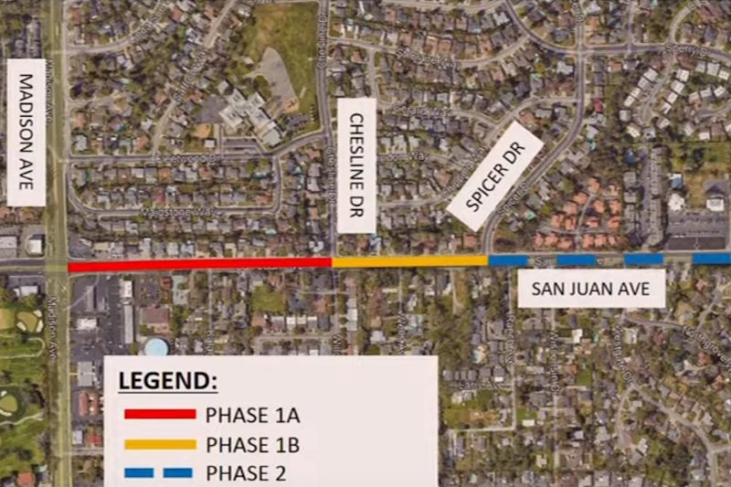Phase 1A improvements will take place on San Juan Avenue between Madison Avenue and Chesline Drive and introduce multiple roadway safety elements, including buffered bicycle lanes, a new sidewalk and new street lighting on the east side of the avenue, traffic signal upgrades, storm drain infrastructure upgrades, roadway resurfacing, and enhanced transit stops which include ADA compliance updates.
