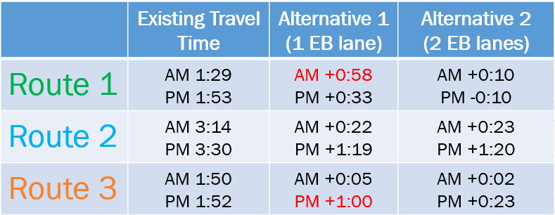 According to data presented by the consultant, lane reductions in both directions would increase travel times on certain routes through the area during peak hours of traffic by 50 percent, or about one minute. The alternative option of only the westbound lane being eliminated would have a less-significant effect on travel times.