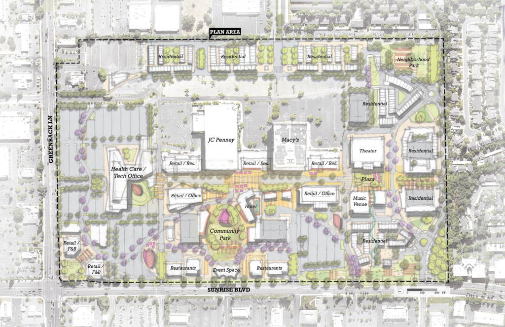 As the city does not own the mall, the Specific Plan being drafted can only set a framework to guide future development at the site, and the city is not able to dictate which specific tenants will set up shop. The Stock Ranch commercial area in front of Walmart on Auburn Boulevard is also guided by a Specific Plan.