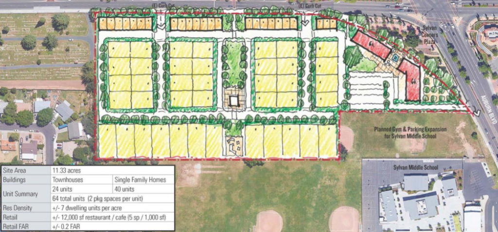 A concept design emphasizing single-family residential shows sufficient room at the site for 40 homes and 24 additional townhouse units, for a total of 64 units with two parking spaces per unit. Room for about 12,000-square-feet of restaurant/cafe uses closes to Sylvan Corners is also shown in the design.