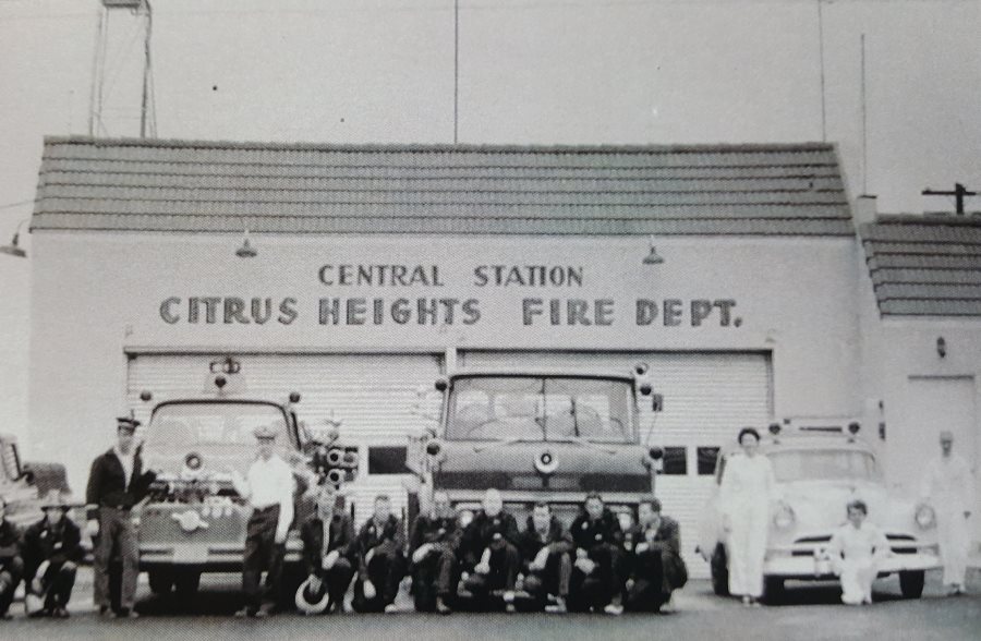 A photo from the mid-1960’s showing three members of the Ladies in White (right) at the old Citrus Heights Fire Department building, near San Juan High School. // Image credit: Desimone Collection, Sacramento Metro Fire District