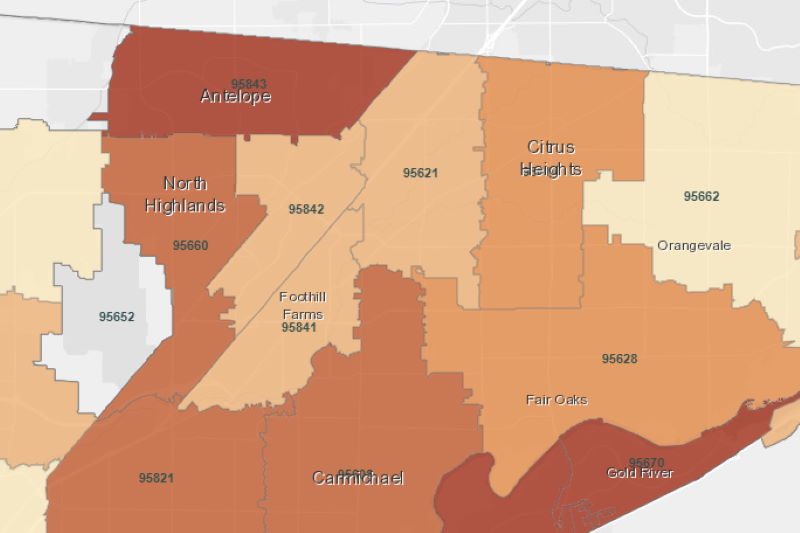 The county’s mapping tool shows areas of the county with the highest concentrations of COVID-19 cases are in portions of Rancho Cordova, Antelope and the North Oak Park neighborhood of Sacramento. Zip codes with under five cases reported tend to be in rural areas on the outskirts of the county.
