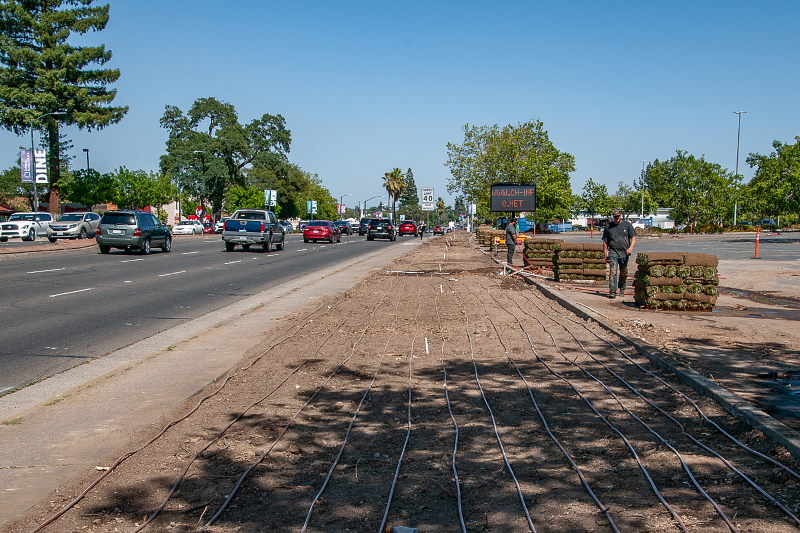 Drivers passing by could see piles of the uprooted bushes as workers prepared to add new irrigation and sod in their place. On Tuesday, drip irrigation lines and fresh rolls of sod could be seen in preparation for install.