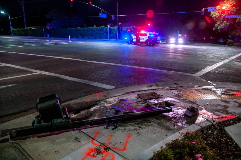 The collision caused the Excursion to careen into a signal light on the northwest corner of Fountain Square Drive and Greenback Lane, sheering it from its concrete footing.