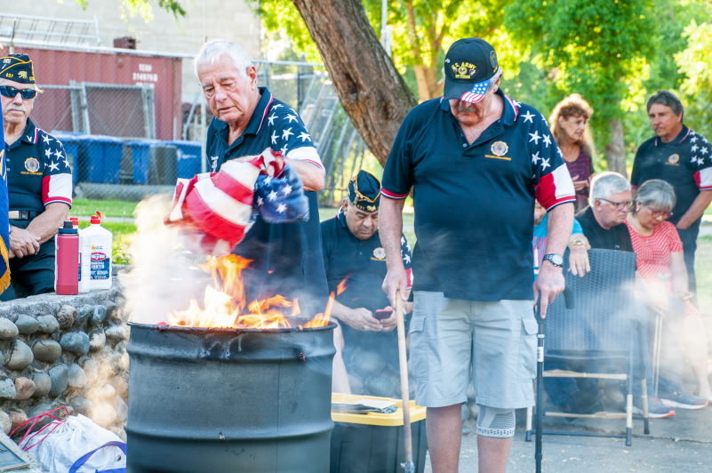 On Monday, Flag Day, veterans from American Legion Post 637 held a flag retirement ceremony at Rusch Park where volunteers disposed of more than 100 flags from community members. Flags were burned in a container, with the ashes set to be later buried at Sylvan Cemetery.