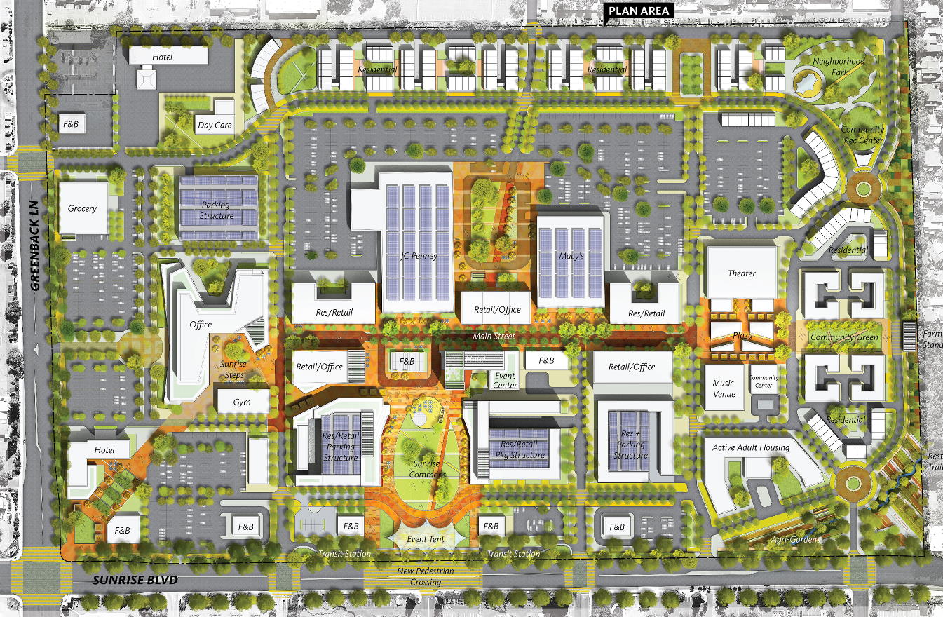 The city’s recently released draft “Specific Plan” seeks to guide re-development of the 95-acre mall property with a vision to turn it into a “21st Century Main Street.” The plan includes significant new event space and a mix of residential, office, dining and entertainment uses, creating a “new heart” for Citrus Heights.